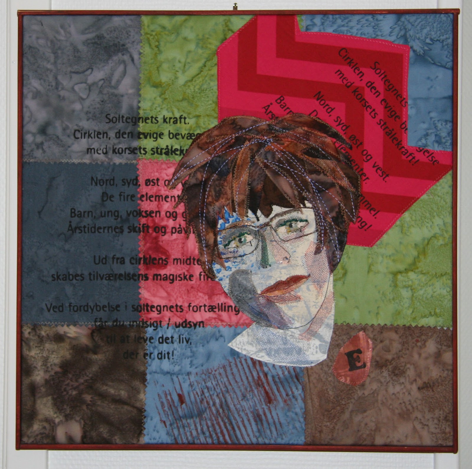 Teppet under viste Lapp-Elisa mens vi spiste. Dette har hun sydd helt ferdig selv, og hun hadde et til i andre farger, som hun til og med hadde quiltet selv - og sydd lukkekant på. Hun har sydd etter mønster, men valgt sine egne farger.